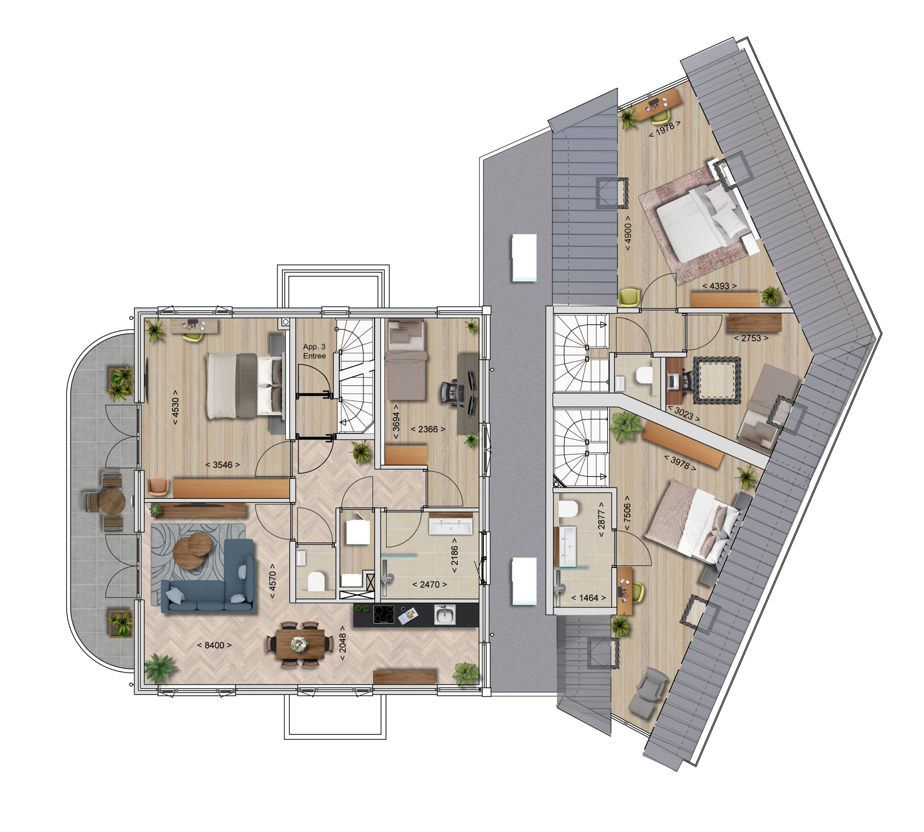 Het appartement beschikt over twee comfortabele slaapkamers. De hoofdslaapkamer heeft eveneens directe toegang tot het balkon, wat zorgt voor extra licht en een prettige buitenbeleving. De luxe badkamer is uitgevoerd met een moderne inloopdouche en hoogwaardig sanitair. Daarnaast is er een separaat toilet.